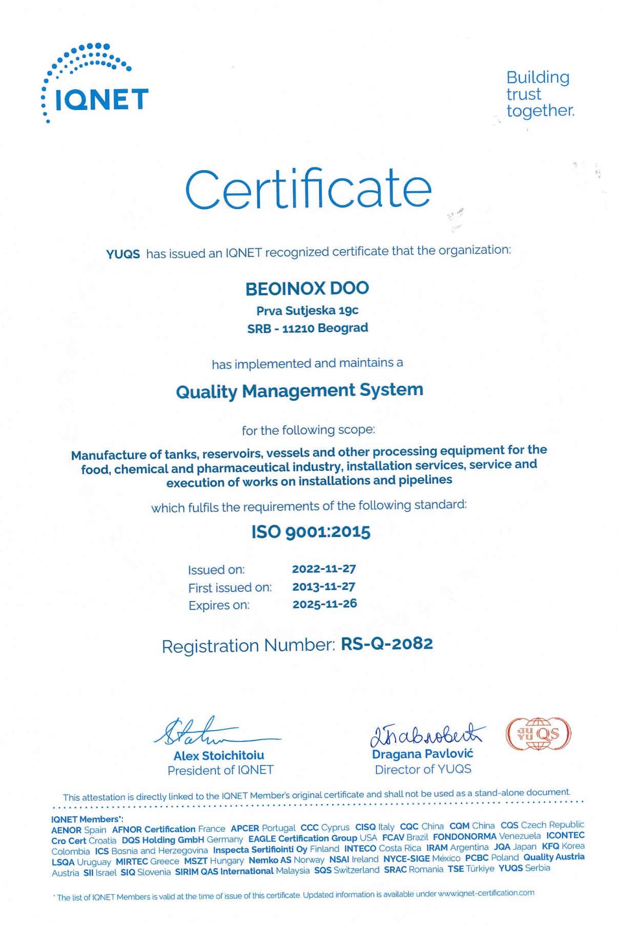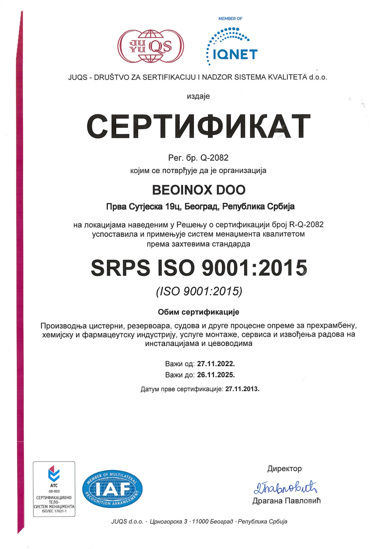 - Svi naši proizvodi su atestirani i zadovoljavaju nacionalne i internacionalne standarde. "BEOINOX" je sertifikovan za rad u Poslovnom sistemu kvaliteta ISO 9001:2015.